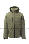 WP 8000 mm H₂O, WVT 5000 g/m² 24h. Men’s padded soft-shell, SBS zip closure with "semi-auto lock" metal slider and customised pull. Adjustable and detachable hood with drawstring. Inner collar with polar fleece side details. Retroreflective strips on the lower back and back of the hood. Elasticated cuffs, adjustable with Velcro. Two side pockets with zip fastening, a breast pocket with coated zip and a pocket on the left arm with integrated pen holder, closed with a zip. Fluorescent pullers. One internal welt pocket, closed with Velcro. Adjustable bottom with customised stoppers.