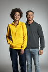 Halfzip sweatshirt with brushed lining in unisex sizes. Two front pockets, 2x2 ribbing on sleeve edge and bottom hem. Modern fit.